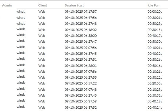 Network Performance Monitor 2025.2.0 - We have been polling recently added Palo Alto devices for just over a year now. There is a read-only account setup in the devices and the nodes in Solarwinds are set for "Poll for Palo Alto" check box is selected, configured with the read-only account credentials. Recently, when we updated the self-signed certificate for the PA devices, we are seeing the Solarwind's polling account logging in between 15 to 60 times an hour and abandoning the sessions. The sessions do expire after 60 minutes of inactivity, but it is a revolving door or new sessions being created and older sessions expiring. All of the data is still be collected and functionality is normal, with the exception of the excessive logins. Screengrab from PA device showing the abandoned Solarwinds Logins.