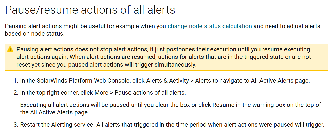 What it Does:That option only affects your current web console session — it temporarily pauses alert actions visible on that page only (e.g., prevents triggering or showing updates while you review alerts).It does not globally pause alert evaluations or email actions across SolarWinds.