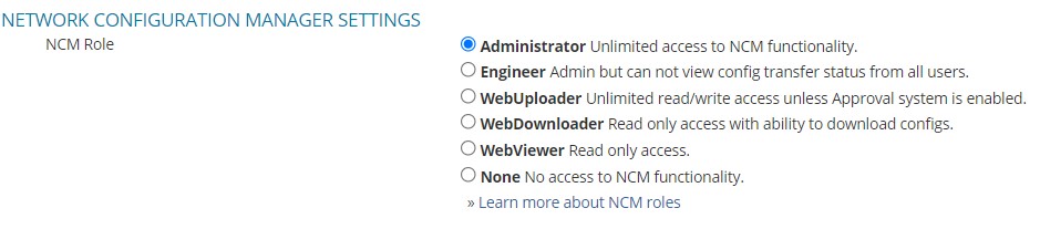 Because of this we can't just give a group of users VNQM access as they need it. It is interesting that VNQM does not actually have roles like most of the other modules such as NCM, IPAM, SAM and so on. I did log a support call and it was confirmed by support that roles do not exist for VNQM and there is no way to allow users to do what they need to do with VNQM without them being administrators of SolarWinds.