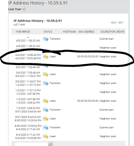 In the screenshot below you can see, Neighbour Scan turns ip to Used, than subnet scan cannot ping the IP and it turns to Transient and this goes on forever.
