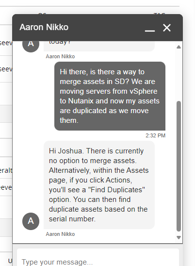Currently I am moving servers from my vSphere environment to Nutanix. As I do so, new assets are being discovered and duplicated in my Service Desk environment. Without the possibility of being able to merge assets, I am stuck recreating values for a bunch of custom fields I use on my asset page for reporting.