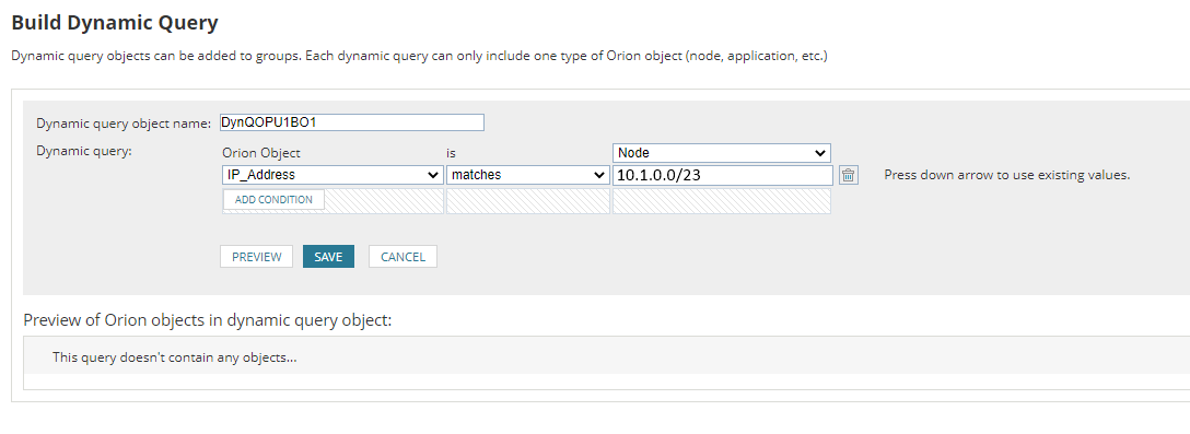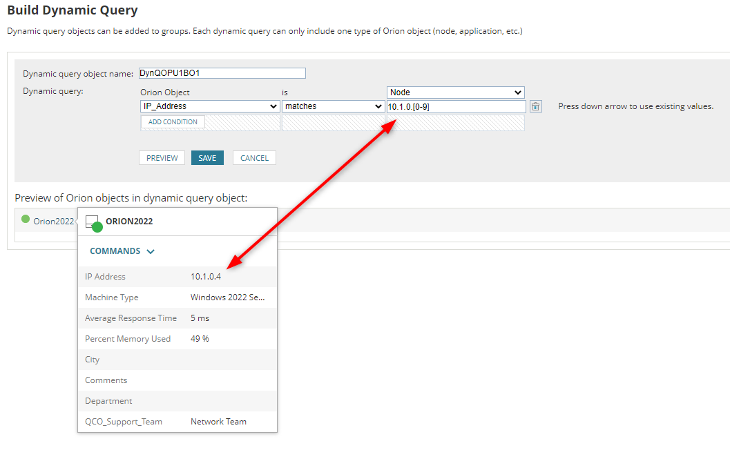 Currently, on 'Dynamic Query' 'Node' 'IP_Address' 'matches' regex with 10.1.0.[0-9] works for one digit but not for a repeat match. Example: 10.1.0.[0-9]{1,3}