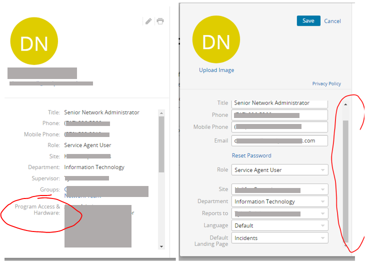 Can we please get the scrollbar to actually scroll all the way through all options when you hover over a user's name and select to View Profile? We have custom fields in our user profiles. Specifically we track some of our software access and some ancillary hardware in a Custom Field (shown in the screenshot listed as Program Access & Hardware but we can never access it directly without having to navigate to Settings > Users and Groups > Users, then search for the person's name before we're able to make updates. This is all because the scrollbar seems to be hardcoded to stop part way down the page. This is shown in the second screenshot where we can scroll no further down the page.