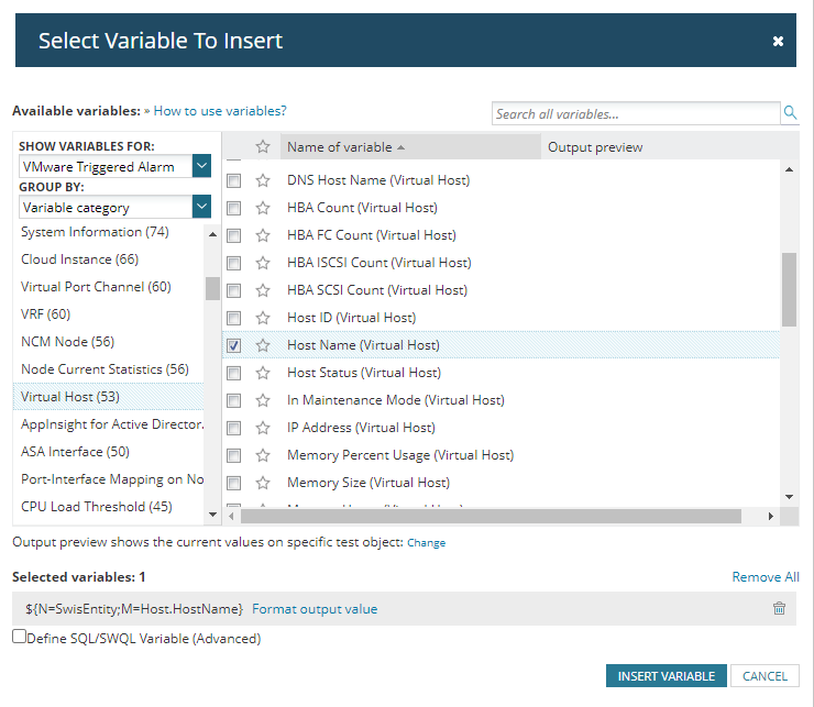When we try and add the vcenter name as a variable it is not listed anywhere when you click Insert Variable.