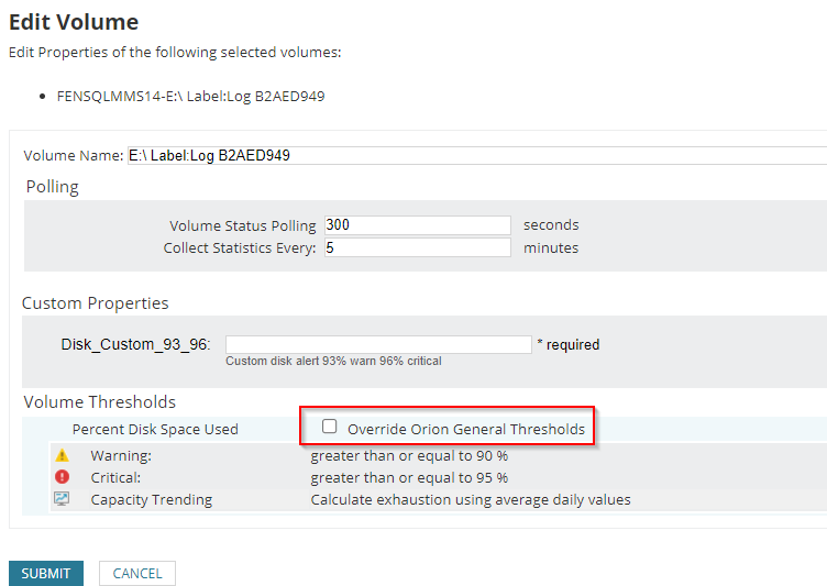 I would like to see the feature when you override the Orion General Threshold for disk space on individual nodes the actual disk space alerts that fire off will be able to see the thresholds that were overridden. Right now it does not matter what I have for the thresholds I have overridden. The alerts only fire on what is set up in the alerts. Some images are attached so you know where I am referring to.