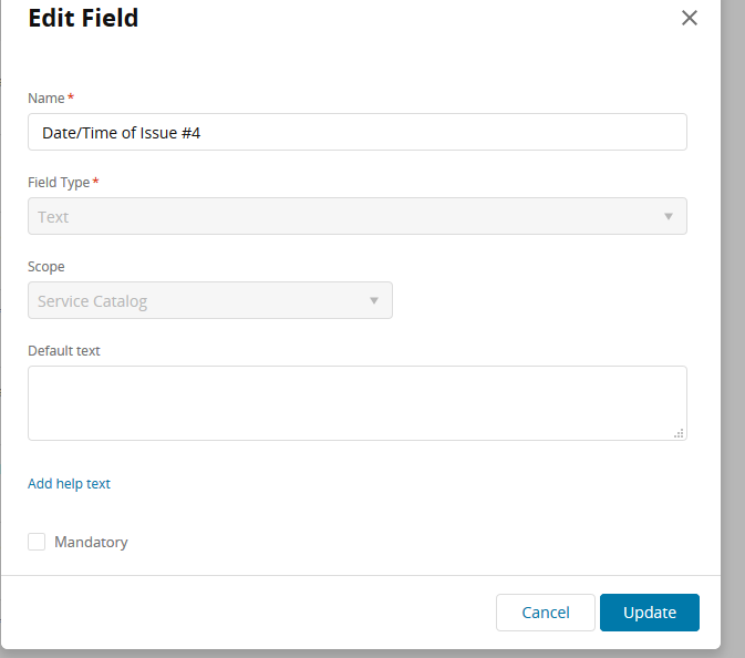 Since this new update to Service Catalogs, I change change a text field type into a date field type, or anything else. I have this Catalog item that has a TON of Logic attached to it so if I have to remove every text date field so I can add a calendar date field then I have to update all of that login. If I could just change the field itself, I don't think I'd have to update any of the logic which would save me so much time.