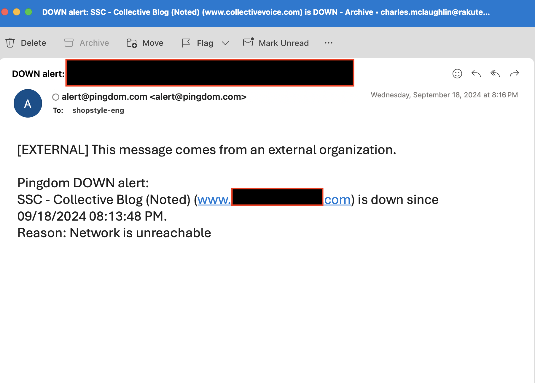 Hi, Right now when we get a pingdom email, there isn't a link to the actual alert. It would be nice if there was a link to the pingdom console that had the failing check. AWS does it and works great. You can click on the link and it will take you to the alarm.