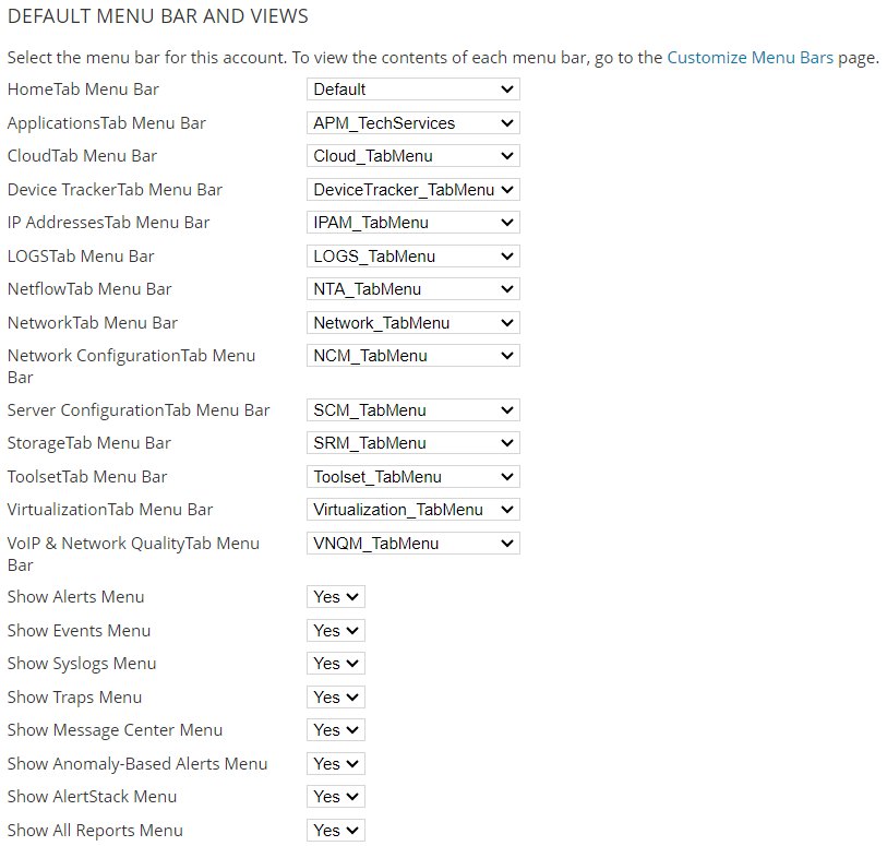 When editing a user, you have the ability to either hide or set the default menu bar for each module. However, you don't have this option for the "Security" menu. The only option is to globally edit or delete the menu.