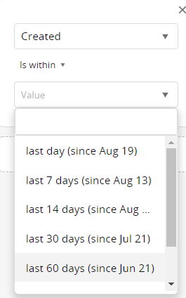 Currently, when you filter tickets using the 'Created' attribute, you do not have a 'today' or 'yesterday' value. These two would be helpful to have.