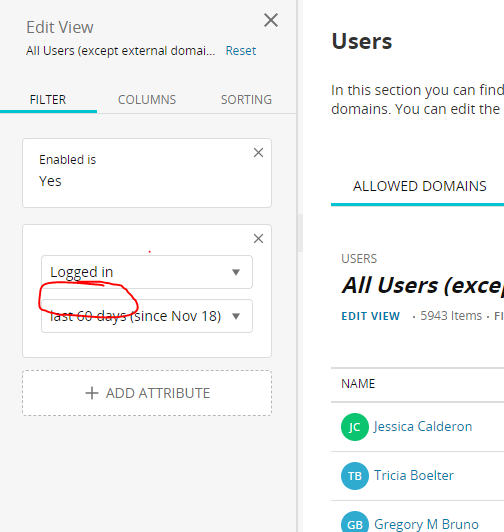 Would it be possible to add the (is/is not) option for this filter to quickly determine users that haven't logged in within a specific time frame? This will help us maintain our license count.