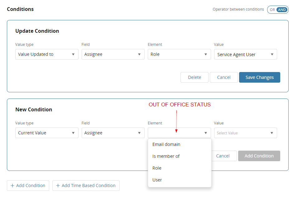 For example - I want to create a notification rule to send me an e-mail if anyone who is out of office is actively assigned a ticket. Right now, I have to create a rule and manually update the agents' names who are out of the office each morning, vs being able to select 'Out Of Office' as a modifier in the rule set to determine whether or not to apply the rule: