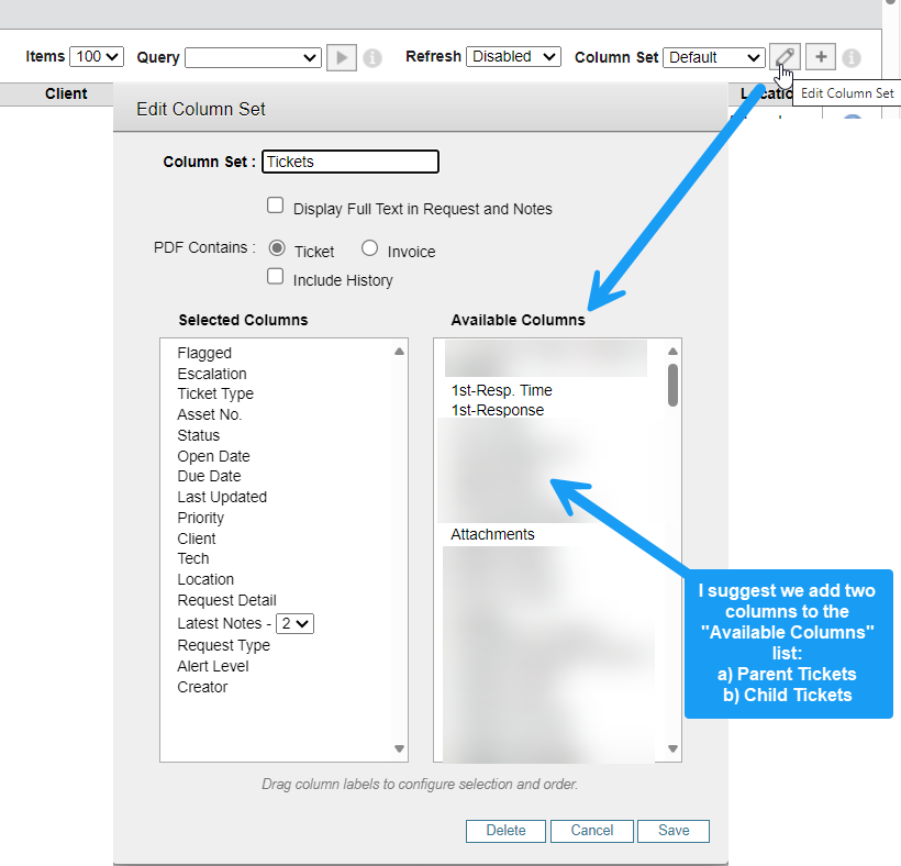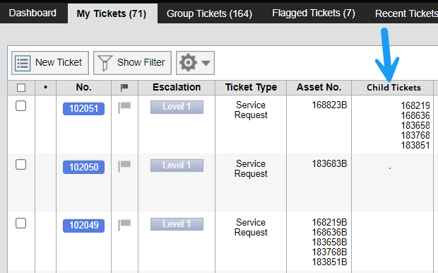 - A visual indicator for parent tickets that have child tickets, and child tickets that have parent tickets