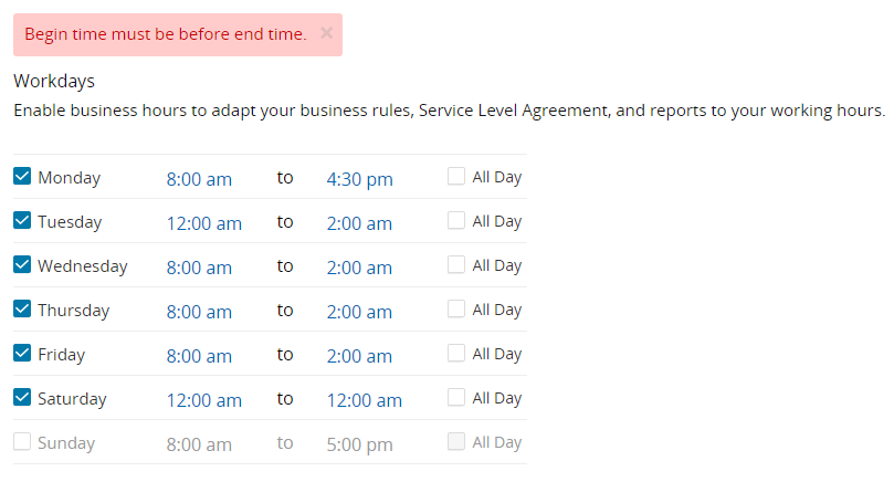 There is currently no way to extend the business hours past midnight in the Service Desk. For example, if I have a business that is typically open from 8am-2am, the Service Desk does not allow this range. There should be a way to either extend business hours into the following day, or allow you to create additional days with ranges, such as Monday 12:00am-2am and Monday 8am-11:59pm