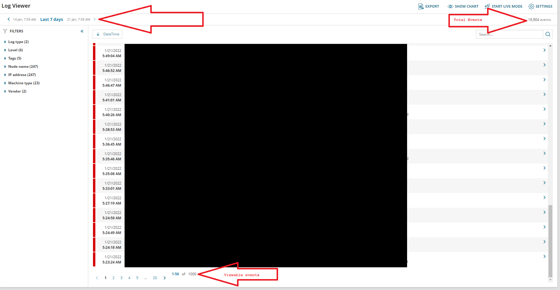 There are only 1,000 log events that are viewable in Orion Log Viewer.
