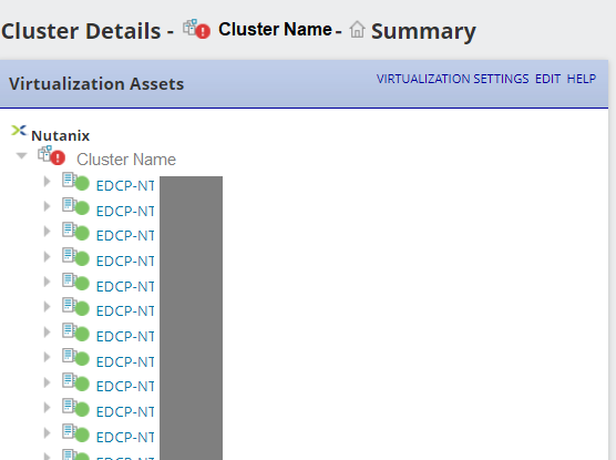 All hosts are healthy. Cluster health only shows as "Critical" with no explanation why it's critical. At this point you need to log into to Prism Element for the cluster to see what is causing the critical state. In this case, a single VM has a NIC misconfigured which has Solarwinds reporting the whole cluster in a critical state.