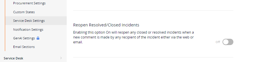 I would like to see the option below separated. One switch for resolved, and one switch for closed. Closed should be the absolute end of the life of an incident, whereas users should be able to respond to a resolved ticket if its not actually resolved, and then it should be reopened for additional work. It would be nice to be able to filter out the responses like "thank you"