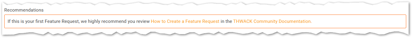 When creating a new Feature Request there is a "Recommendation" field with a link to "How to Create a new Feature Request", but the link is broken and results in a "Page not found" error.This is the link that appears to be broken: https://thwack.solarwinds.com/resources/thwack-command-center/w/thwack-documentation/57/how-to-create-a-feature-request