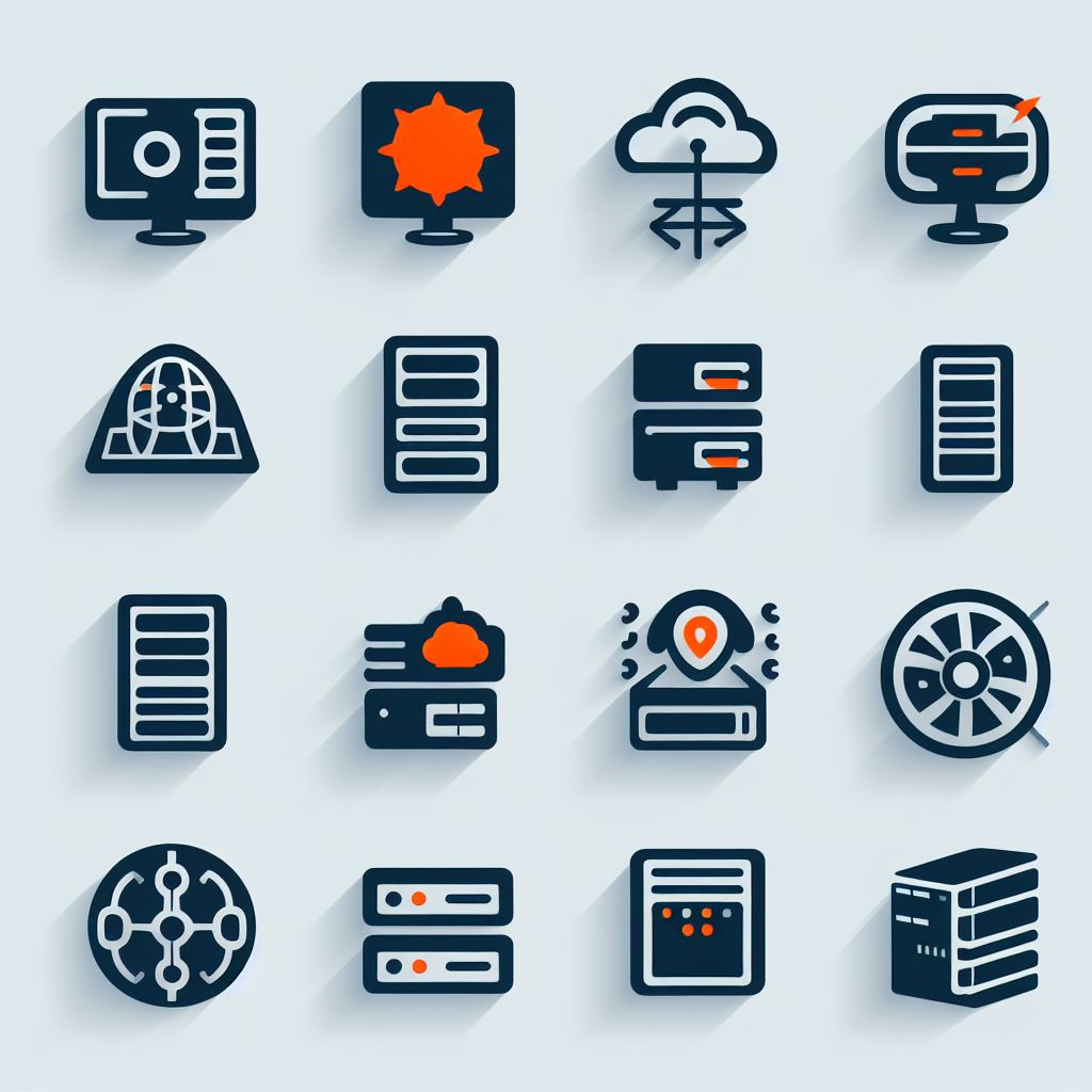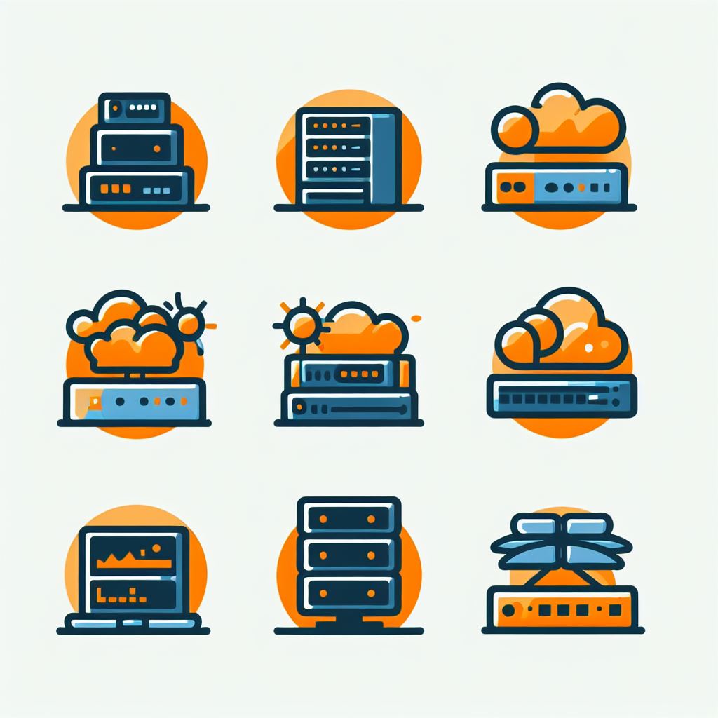 I have been using these prompts : an orange and white and black set of icons, showing a range of application servers, on white background, clear vector art, png style, ,minimal, perfect lines,