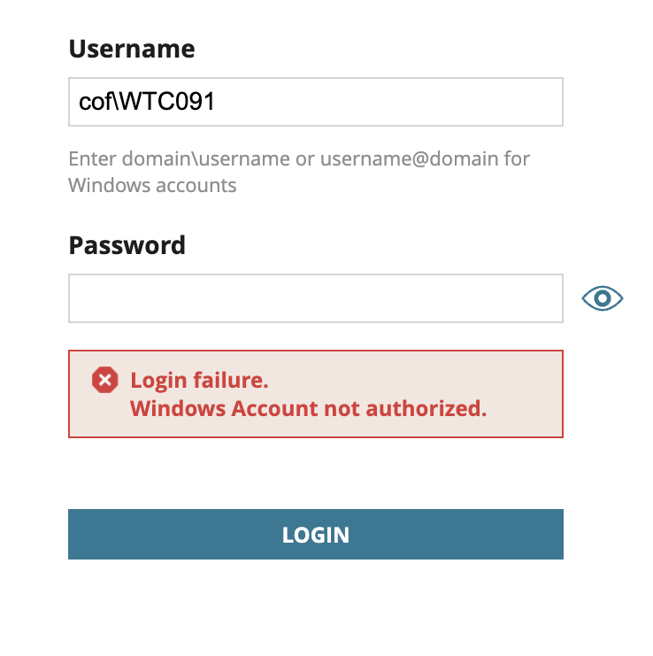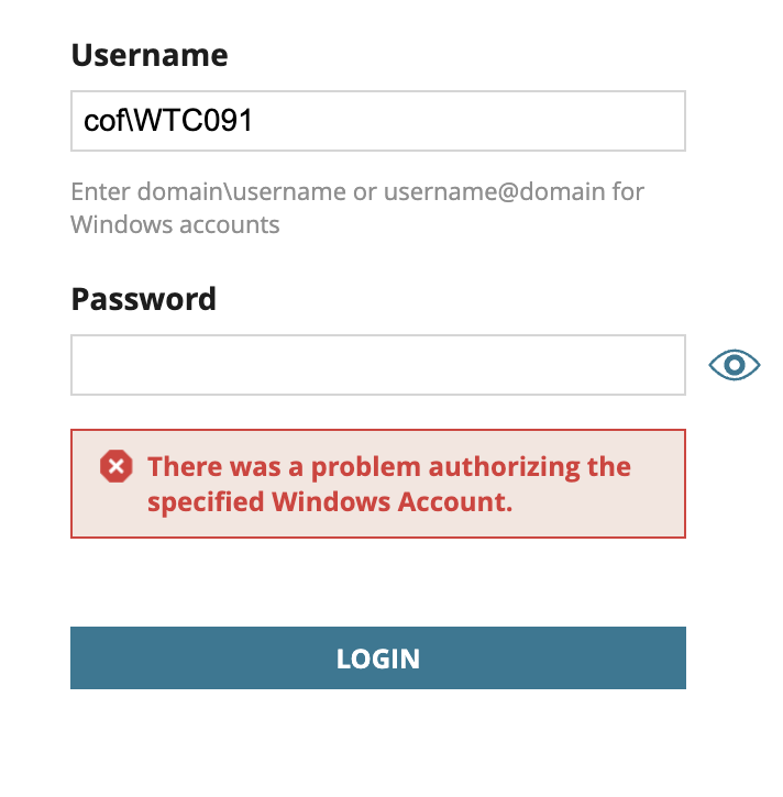 - Using a valid set AD user and password that isn't in the AD group needed to access SolarWinds results in the error 'Windows account not authorized'.