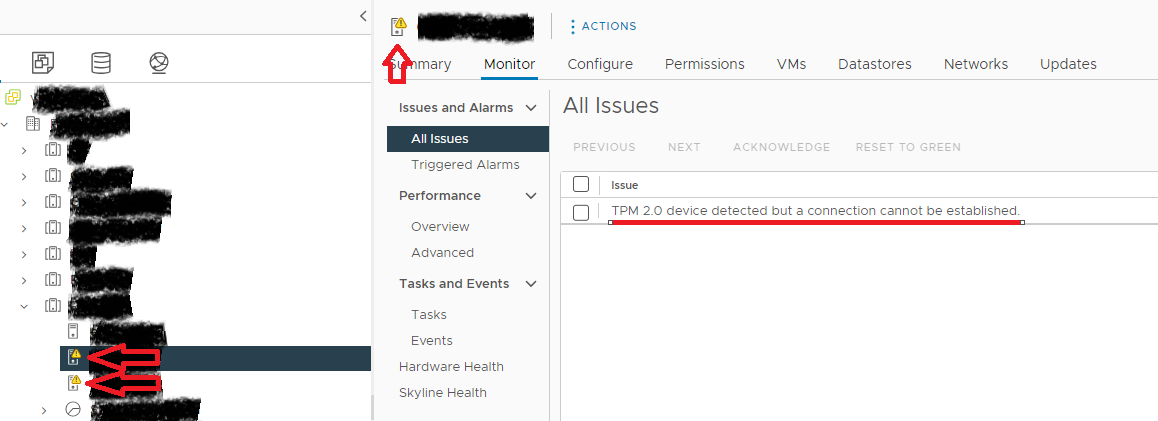 Example alert in vCenter (red arrows pointing to host state, red underlined - alert message):