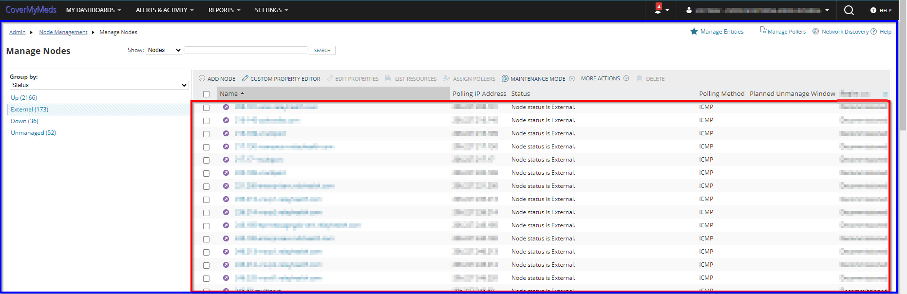 It'd be great to be able to freeze the column names / column titles on the Manage Nodes page just like in Excel. Currently when one scrolls down on the Manage Nodes page it scrolls the blue high lighted area in the image. This means that if you have a large number of nodes the "Group by" information and the column names disappear of the screen when one scrolls down. I suggest making the frame with the return results the only thing that scrolls and the rest around it stay stationary like the red high lighted area in the image.