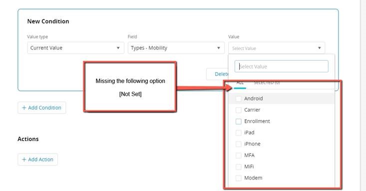 In the Automations module, I’m trying to create logic based on a custom field missing a value. Currently, when I try to create a logic parameter based on a custom field I am only provided the option of selecting a specific value but not a [Not Set] value which reflects the absence of a value. For comparison, I am able to do this if I am evaluating either the Category or Subcategory fields in the logic as those both provide the [Not Set] option but a custom field does not.