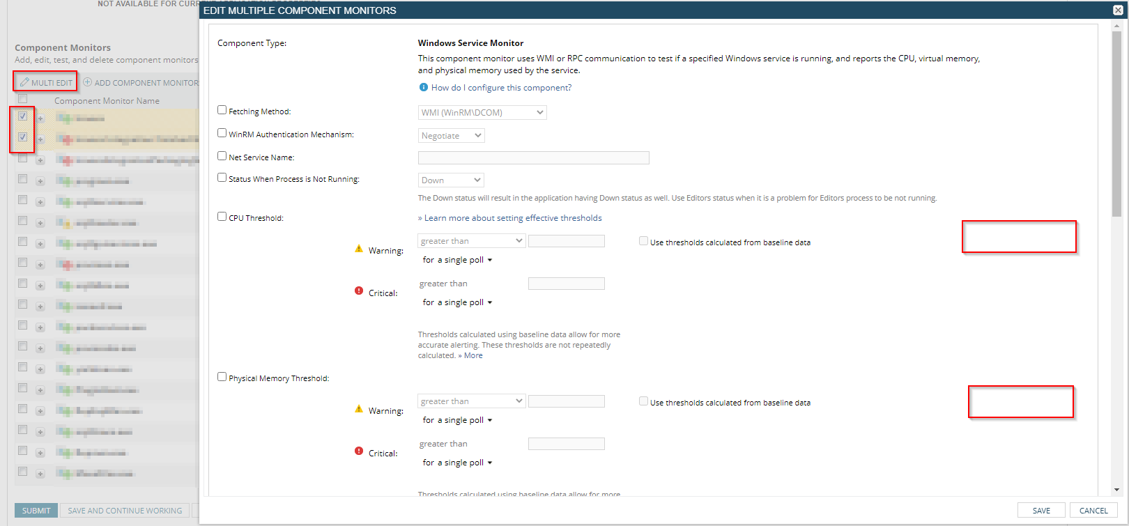 I was trying to switch my application monitors over from the baselines to static values because the baselines were not working well. I edited the template just fine using bulk edits (my application template has over a dozen components).