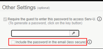 The security department requires that shared links are password protected and they do not allow users to include the password to the password-protected link in the same mail. Via the Serv-U settings, they have enforced passwords and also disabled the option to include the password in the mail to the recipient(s). When disabled, the "Include the password in the email" is grayed out but still visible to users.