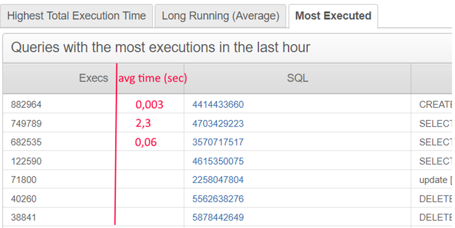 Same for how long the queries take where there are a lot of executions. (Most executed tab)
