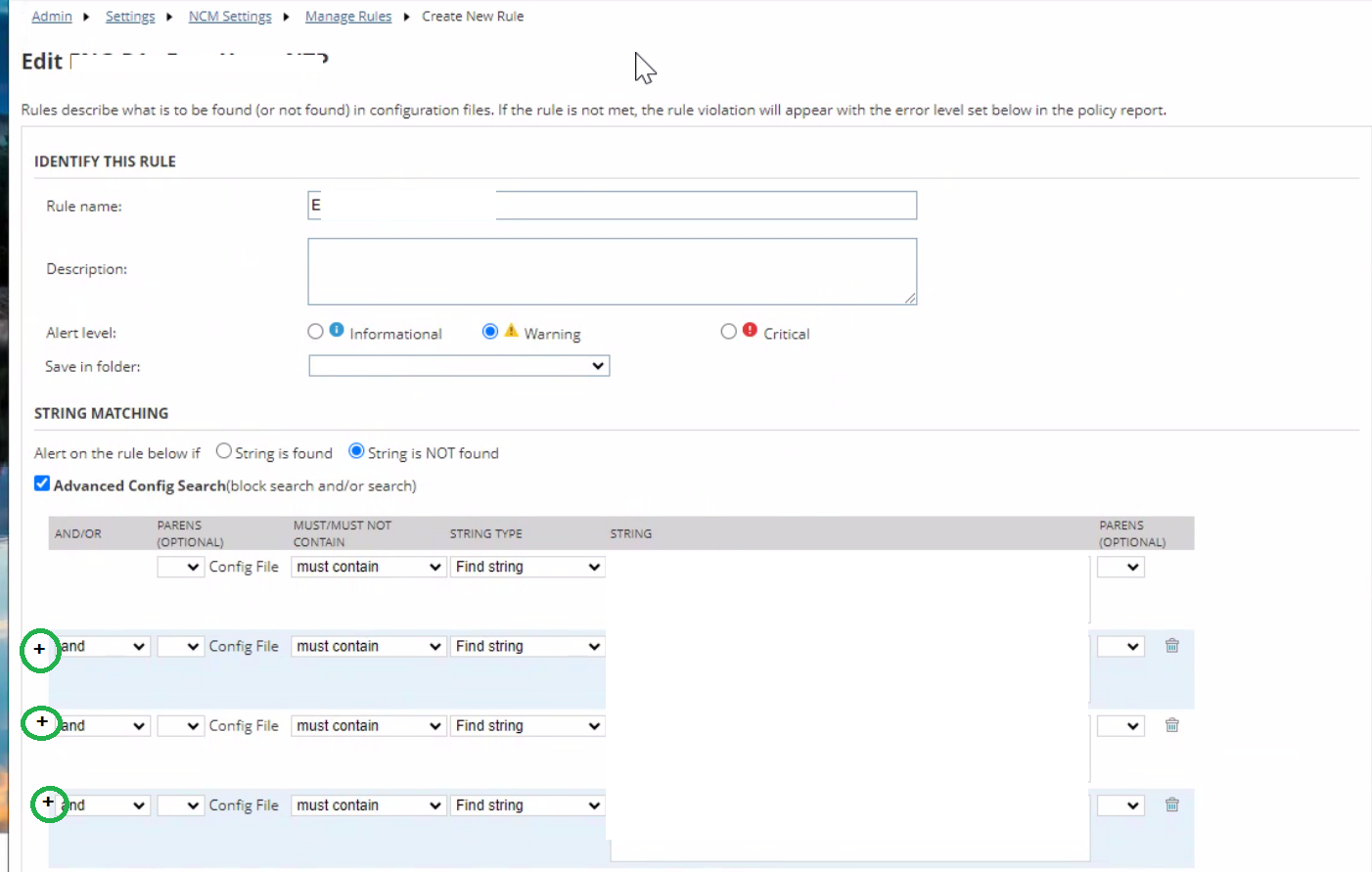 We found that we are unable to add lines in between existing lines when we are editing NCM compliance rules. Currently we have to create a line at the bottom and copy and paste the strings to get them lined up. In the mockup screenshot below, we'd like the ability to be ability to add new lines (as noted by the green circled +s).