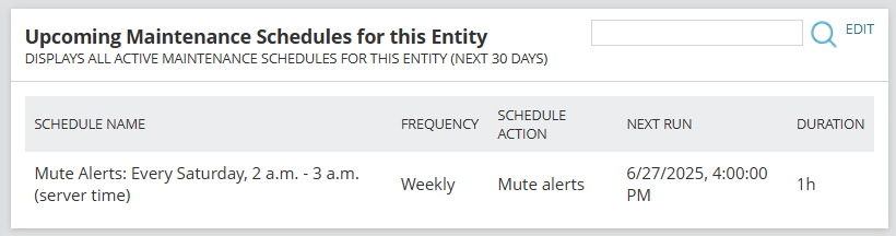 Out of the box Resource on the Node Details page detailing the Maintenance Schedules assigned, duration, and frequency of the maintenance, as well as the next upcoming window for that particular entity.