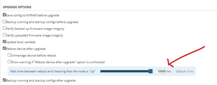 Within the NCM Firmware Upgrade template there is an option under "Reboot device after upgrade" to set the "Wait time between reboot and checking that the node is 'Up'". In my use case, this is great to use when I need the module to confirm that my devices are running the firmware I installed after a reboot. The problem is that the max wait time that can be set is 10,000 ms which is 10 sec. Many of the devices in my production space can take up to 30 minutes to reboot. If I have this timer set under the reboot option and use the NCM Firmware Upgrade module, the job will error out after some time.