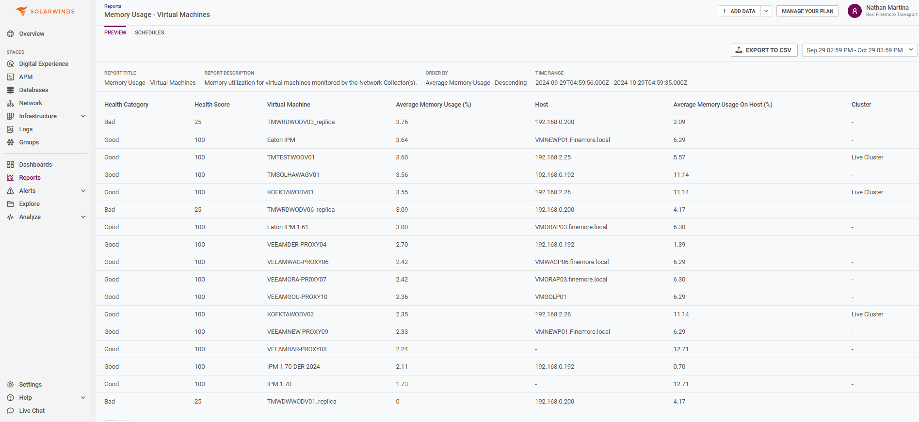 In the example below, there's a "Average Memory Usage on Host %" which is good, but "4% of what?" What about the total Gb/Tb of RAM on the host too? And filters by host, show totals in this screen? The ability to carve up these tables dynamically all the way through SWO would have with troubleshooting customer networks and reporting for our customers. If i can add whatever columns I want (columns that are related of course) I can product really powerful reports from this data on a situation by situation basis. And the ability to save my filters to my profile, or save them globally for other SolarWinds uses similar to HCO dashboards would be fantastic too!