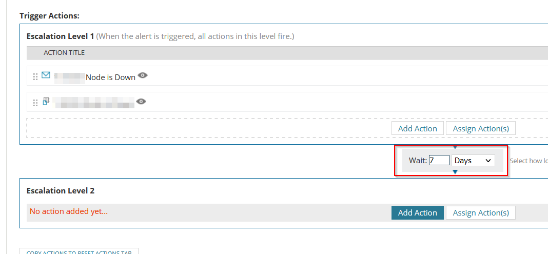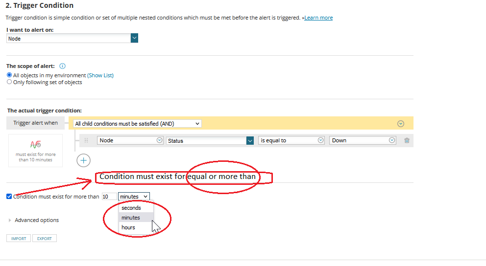 When I create a new alert, the "condition must exist for XXX (Seconds, Minutes, Hours) There is no Days option, and if I select Hours and set it to 168 hours (7 days) the alert will flag everything that has been down for 24+ hours. What do I need to do to be able to create an alert / email for nodes that have been down for 7+ days?