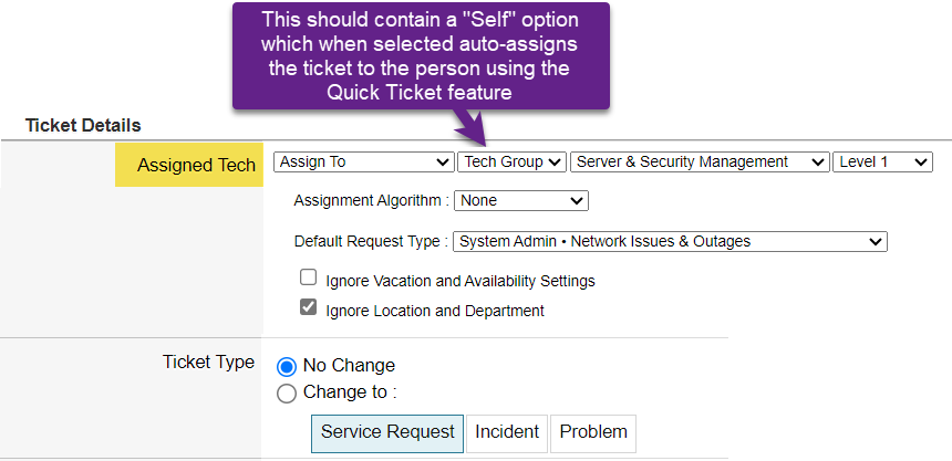 The existing "Request Type" field on the Quick Ticket can be removed as the new "Default Request Type" field shown above, would take it's place. By making the changes above, the programming for Quick Tickets could be vastly improved to allow you to continue to define the "Request Type" to use on tickets created using the Quick Ticket feature, but also now specifically identify what should happen with the ticket once it's saved in terms of ticket assignment.
