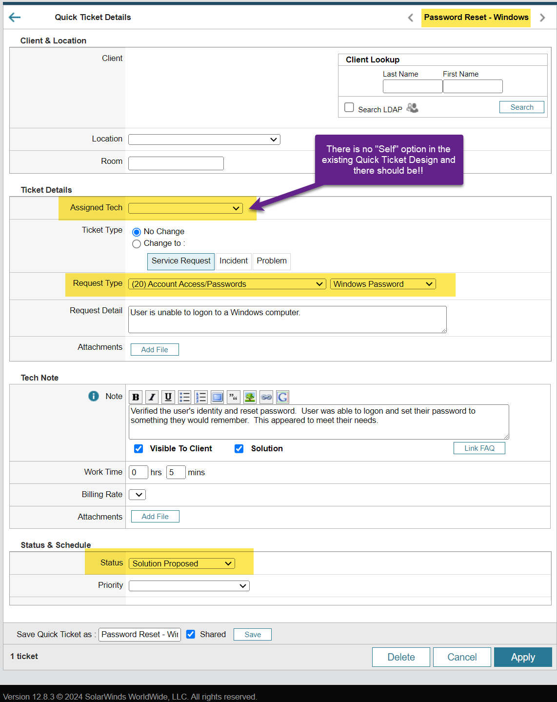 That means that in situations where someone creates a ticket using the Quick Ticket Feature which is programmed to set the status to "RESOLVED" (i.e. Solution Proposed or Even Closed) and a description and note is added like what you see in the example Quick Ticket programming shown above, in order to get credit for resolving/closing the ticket, the tech needs to remember to go back and change the "Assigned Tech" to themselves as a separate step and then save the ticket again. That's because the existing Quick Ticket feature presumes by default...that all tickets created using the Quick Ticket feature, would be assigned off to other staff - not the user creating the ticket.