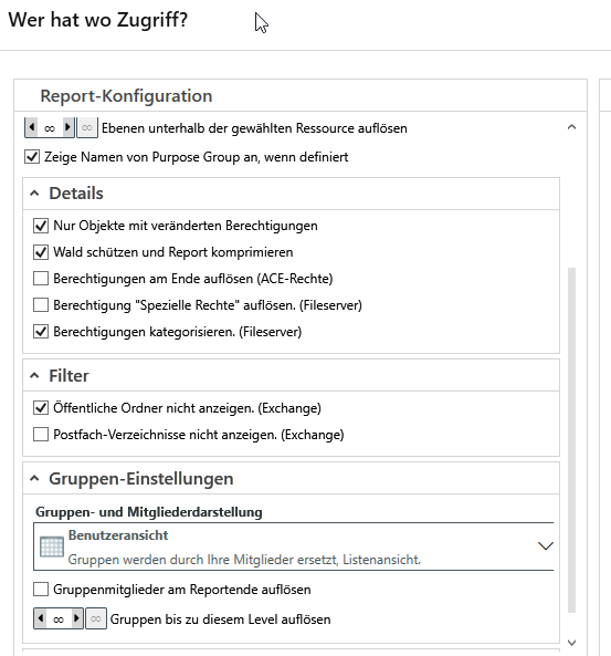 The Dataowner do not care if the user need the permission "show content of folder" on level 1-4. He just want to know who read or write on which folders. This problem can get a Report unreadable very fast if just one list-group is pretty big (> 20 users).