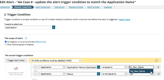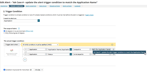 - If the Application Monitor Name changes, you'd have to update the alert trigger condition to match the Application Name to the New Name