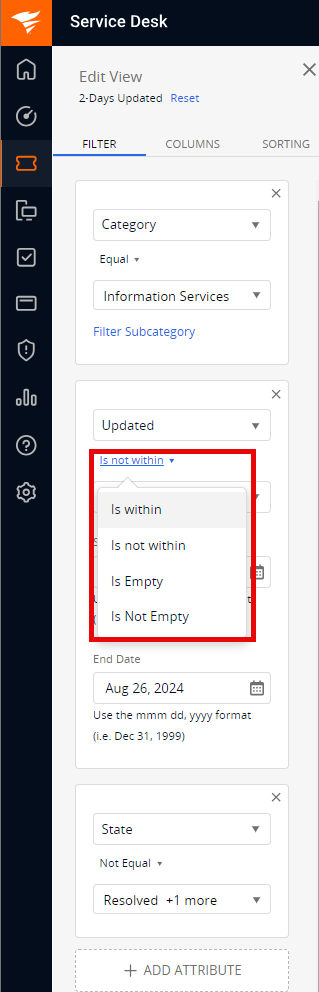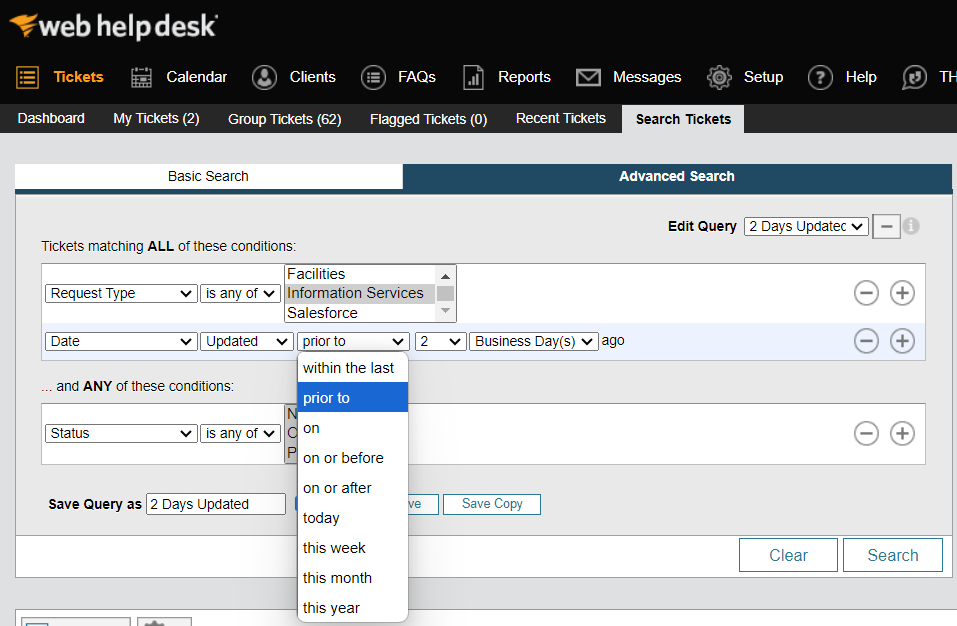 In SolarWinds Web Help Desk the Ticket Searching is robust allowing very granular queries