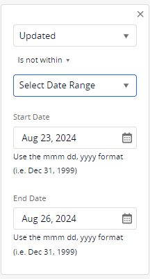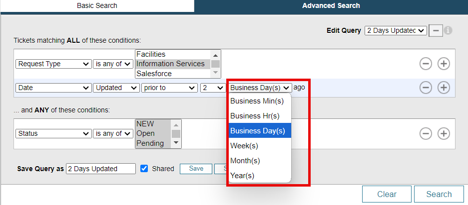 Example: Searching for Incidents that haven't received a Tech Note update in the Past 2 business days.