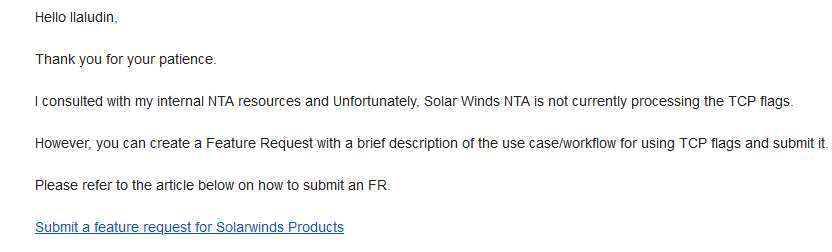 Our customer requested to flag tcp reset in solarwinds, i have opened ticket. But from TAC there is no way to do flag tcp reset. It is suggested to use feature request. Is there anyone here who can help with this issue?