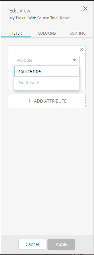 When editing a view in the Tasks view, it is possible to add the 'Source Title' column which will display the title of the source object that generated the task. I would like to be able to filter the view based on keywords in the Source Title, but this is not currently an available filter option. You can only filter on Source Site, Source Object, Source Department, Source Requester, or Source State.