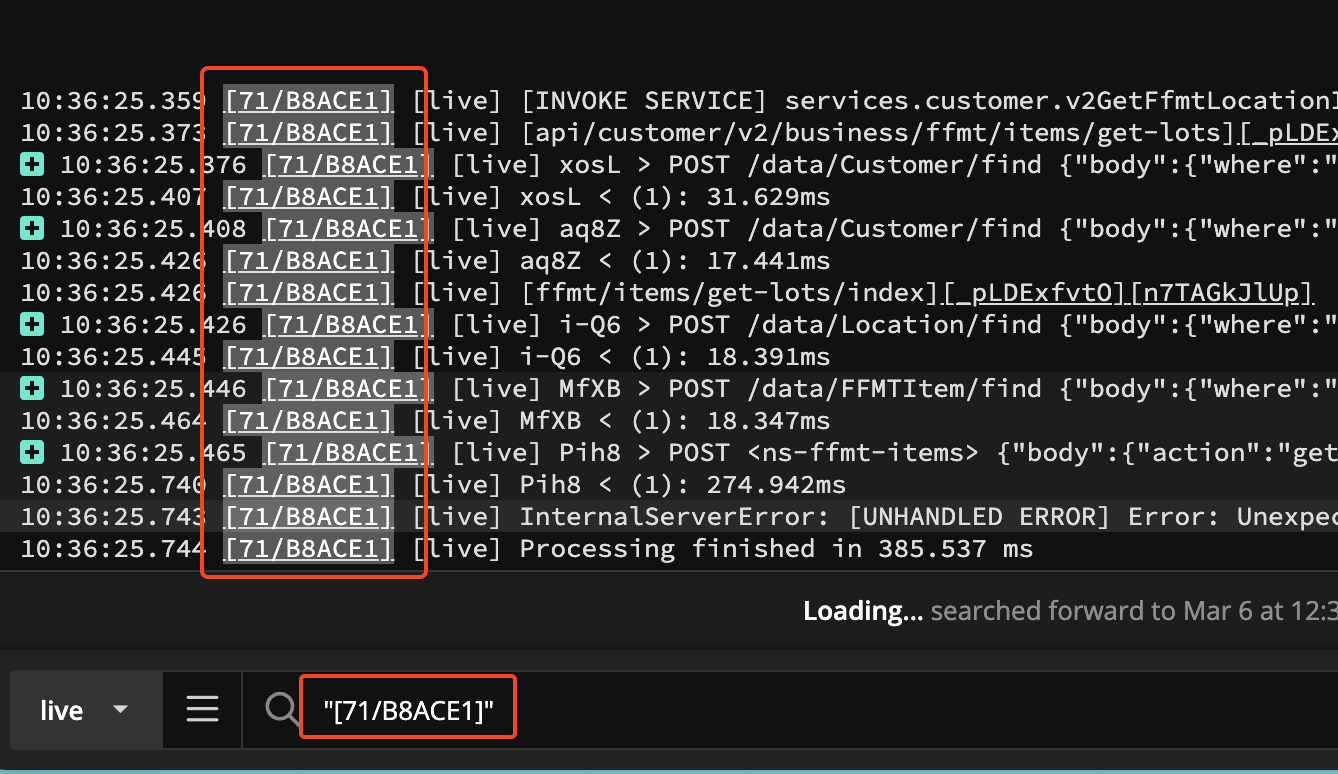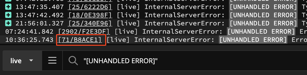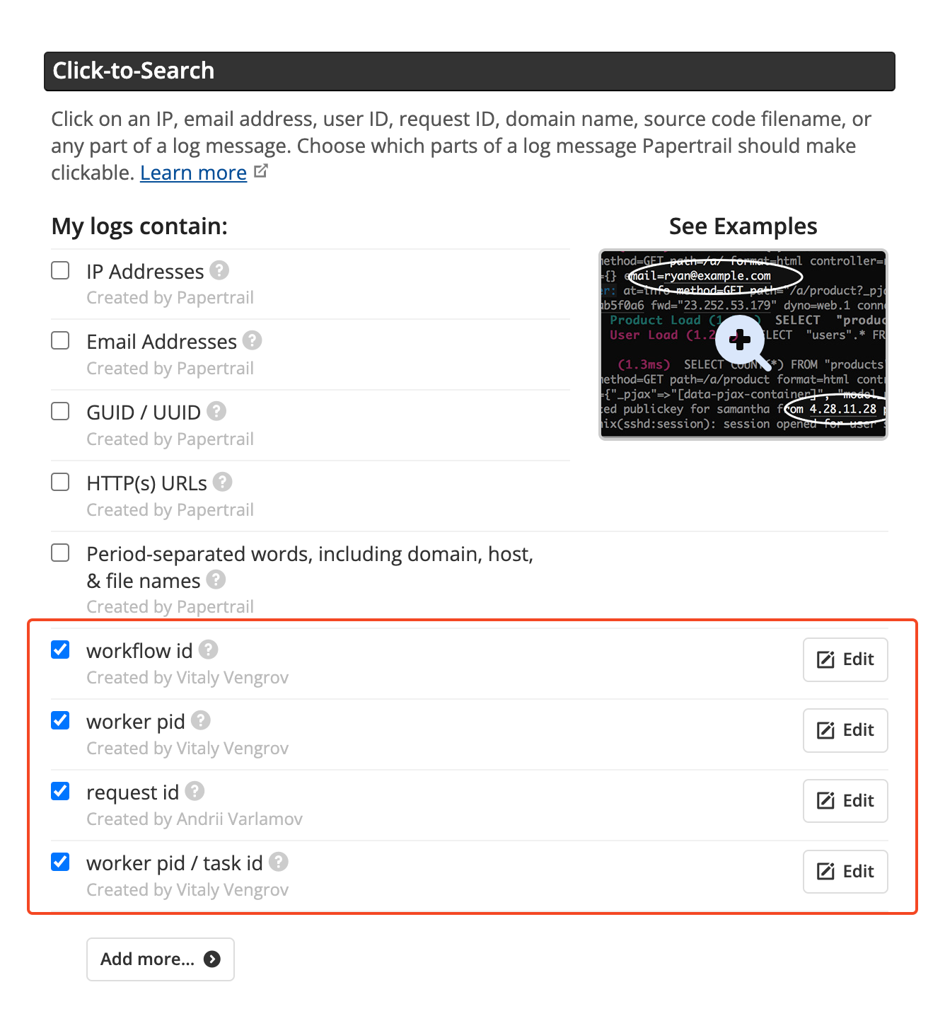 In Papertrail, the "Click-to-Search" feature allowed users to define custom clickable elements using regular expressions. This was an essential capability for quickly filtering logs based on structured patterns like request IDs, user IDs, or error codes.