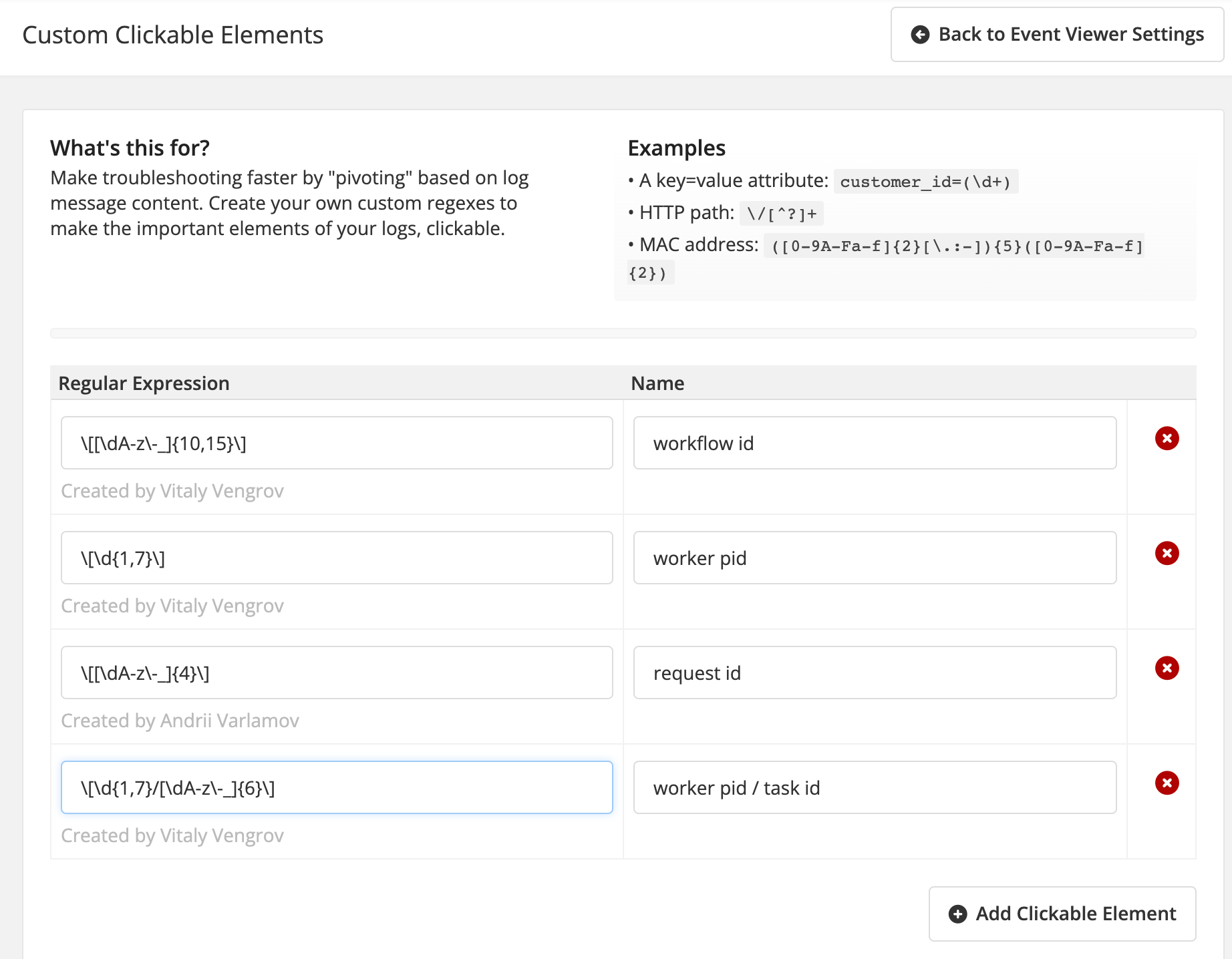 - Custom Clickable Elements – Allow users to define regex patterns that turn specific log elements into clickable links, automatically triggering a filtered search when clicked.