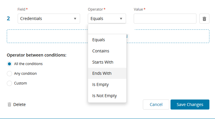As shown below, I need "Credentials do not equal RN". Otherwise I would have to do "does equal" and think of every possible provider credentials there are. Ive seen "does not equal" in other areas of SolarWinds, like when filtering incident lists or dashboard. Please add it as an option to Service Catalogs.