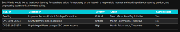 While we’re always excited about the new features in each release, it should be noted we’ve always included security patches, as well. As with any other software, it’s necessary to consistently patch vulnerabilities while providing feature updates and product bug fixes. Our release notes always contain information on the features, fixed issues, product improvements, upgrade and installation notes, and standard deprecation notices and legal notes. Recently, you may have noticed a new addition: vulnerability patches including the CVE and ZDI details. In the Orion Platform 2020.2.4 release notes, it looked like this: