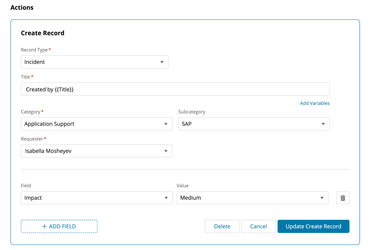 Please note the new Create Record action uses variables such as Title, Priority, and Site from the ITSM object that triggered this action. Create Record can also set the Category, Subcategory, and Requester as well as custom fields for the new ITSM object. For more details on this capability, please see our technical documentation.