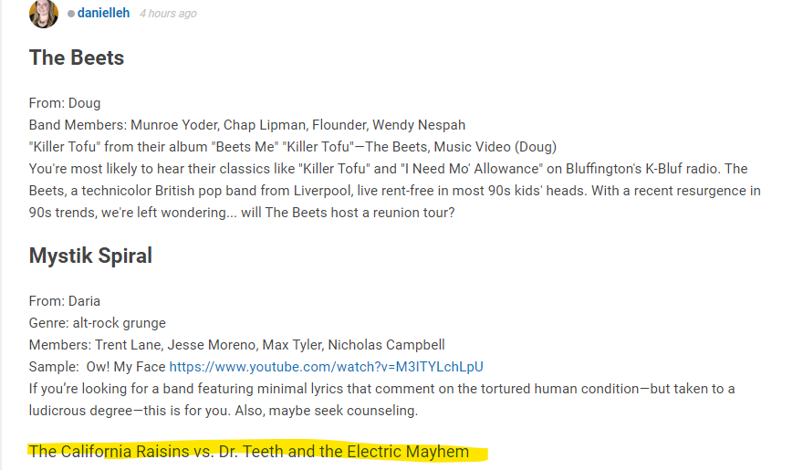 You're most likely to hear their classics like "Killer Tofu" and "I Need Mo' Allowance" on Bluffington's K-Bluf radio. The Beets, a technicolor British pop band from Liverpool, live rent-free in most 90s kids' heads. With a recent resurgence in 90s trends, we're left wondering... will The Beets host a reunion tour?