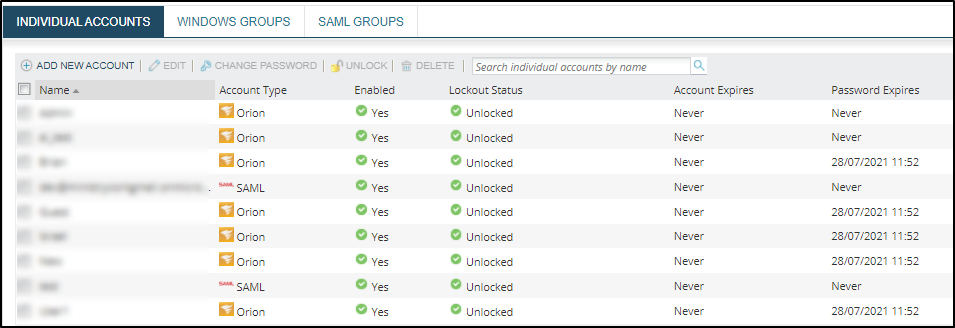The requirement to change password, changes to the minimum password complexity, and account lockouts apply only to Orion Platform local accounts. Other Orion Platform accounts such as Windows/SAML are not affected.