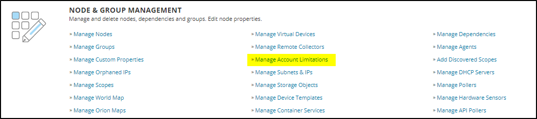 Here you will also notice a link to directly manage account limitations, which can also be accessed from the Node & Group Management section on the Main Settings & Administration page.